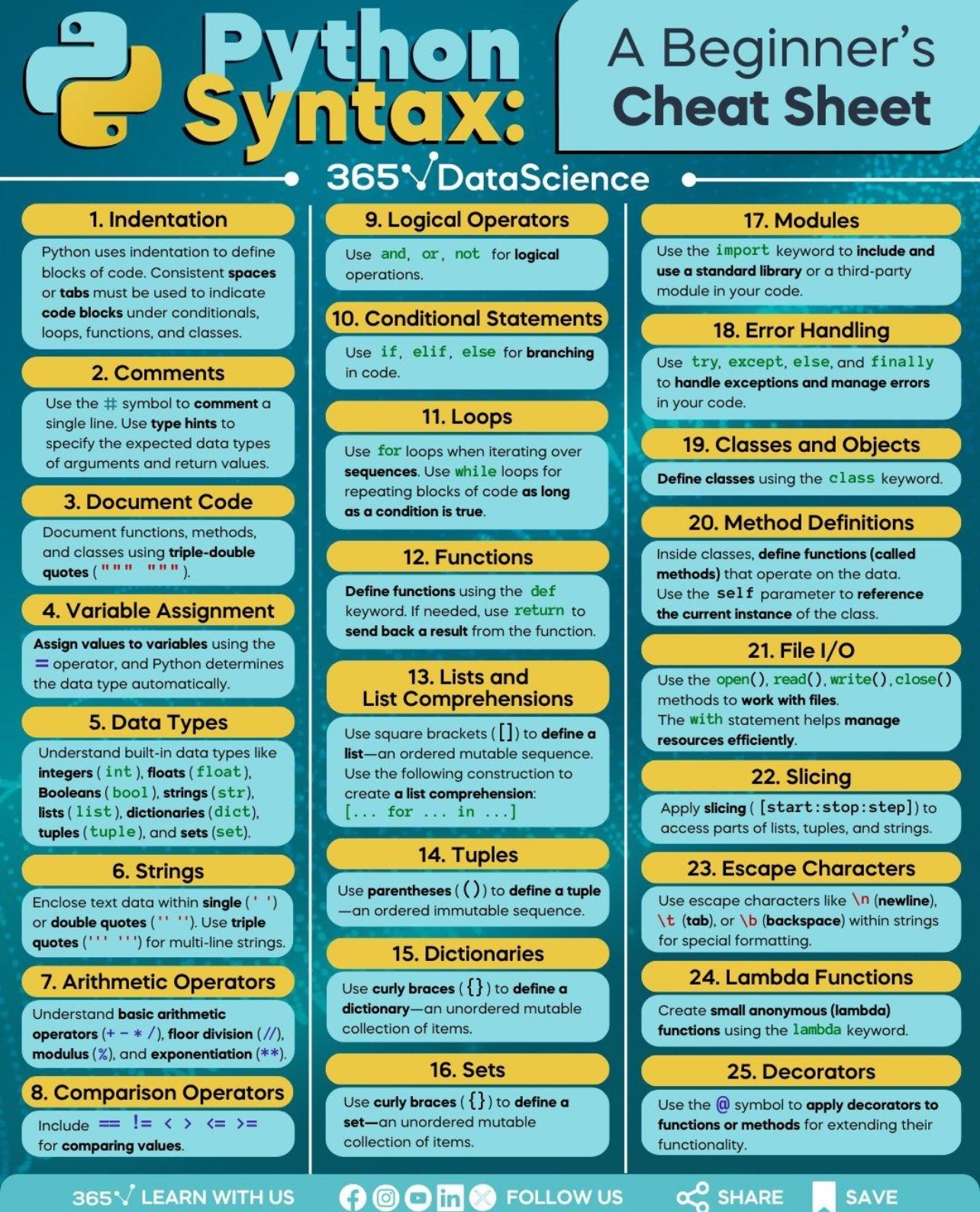 Here blow is a Python syntax cheatsheet for beginners. Browse over it and see how many of the concepts/details you already know.