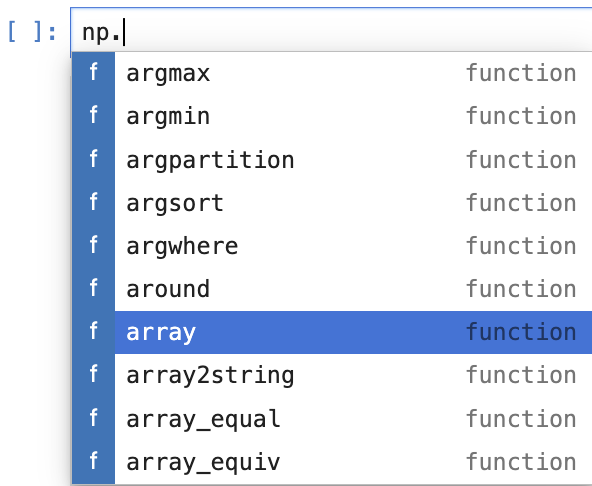After you import the library, you use the dot operator to access the methods/functions and attributes inside the module/library. Just type the name of the object, and then the dot (.) and the Tab key to show the menu. You can scroll down to select the methods. In this case, we choose the array method (note: the Tab key can also do autocompletion).